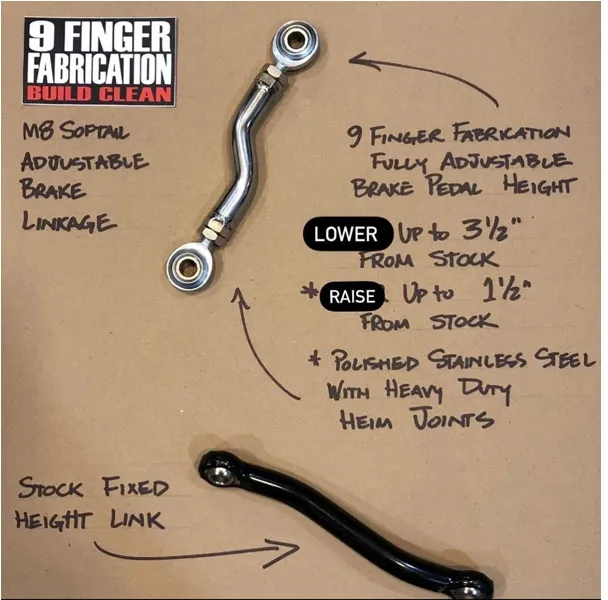 ×Fully adjustable for brake pedal height. Direct replacement for the stock non-adjustable brake linkage. Allows adjustments of the brake pedal from 3-1/2" lower to 1-1/2" higher to compensate for seating height, rider length and preference. Provides quicker and more comfortable brake actions. Stainless steel, complete with heavy duty heim joints.