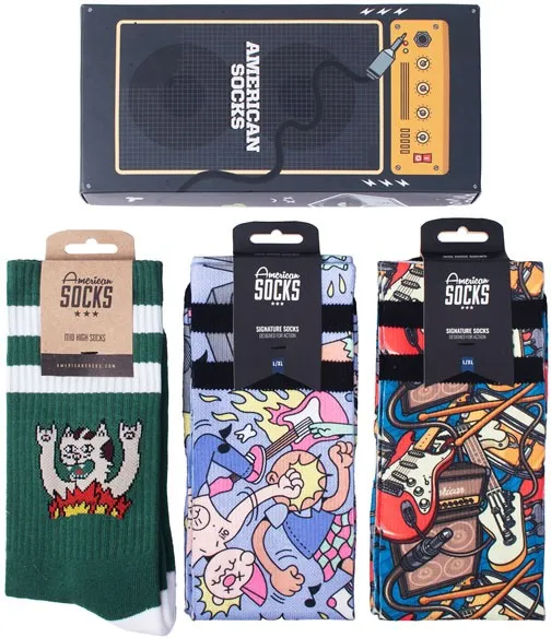 ×The Sock Gift Boxes from American Socks are more than just socks in a box. Each set comes with 3 pairs of our best crew socks designs, created in collaboration with artists. From a skateboard-shaped box to a coffin with Dracula or a guitar amp, every gift set is as unique as what's inside. Perfect as a birthday present or just because you can, the sock gift boxes are unisex and made to thrill skaters, surfers, gamers, music fans and anyone into tattoo designs. Find your perfect gift box and surprise someone you care about with socks that truly speak their language. Mid High Length - Half-way of your lower leg Two Sizes for a Perfect Fit or one size fits most Designed for Action and Comfort Moisture-Wicking Technology to keep your feet cool and dry 67% Coolmaxr, 17% Polyamide, 10% Cotton, 5% Elastane Machine Wash at 30C/86F. Do not Tumble Dry, Bleach or Iron