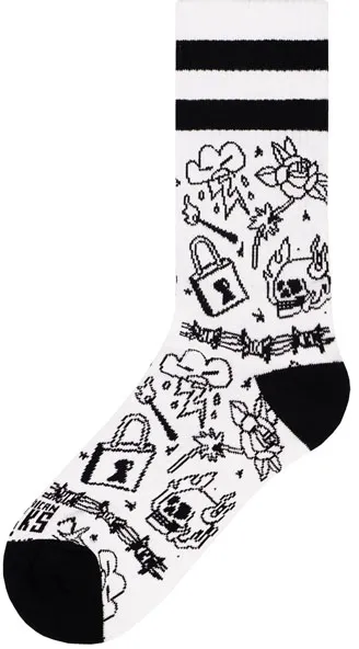 The Mid High Socks by American Socks are a staple. Made from soft cotton, the crew socks have a mid-calf fit. All of them are fun socks with bold patterns and graphic designs that scream attitude. Inspired by streetwear, tattoo art, skateboarding, alternative music and Japanese style, every pair is a canvas. Created in collaboration with artists, these are the perfect gift socks or present. Durable, breathable, unisex and always comfortable, these crazy crew socks with stripes are built for all terrain, from skate sessions and concerts to chilling with friends. Fun, Original, Funky and alternative, they're socks that say something about you. Find your pair, and join the crew! Mid High Length, half-way of your lower leg Vegan friendly Comfy cotton blend One size fits most - 36 to 46 EU Composition: 68% cotton, 16% polyamide, 8% polyester, 7% elastodiene, 1% elastane