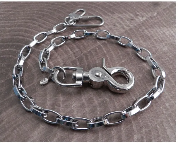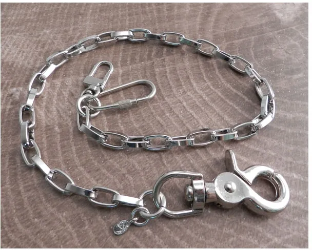 ×Silver, medium-weight chain with large open oval links, chrome-plated steel, chain links 5/8" lenght by 5/16" width, the sturdy snap hook and dual wallet hook end-pieces adds approximately 3" to the chain length