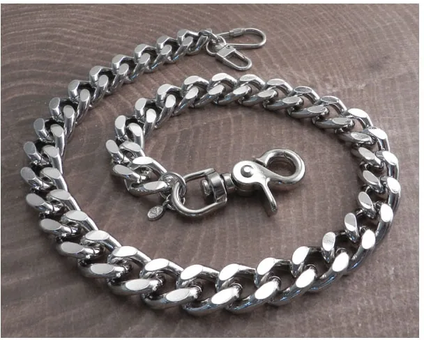 Silver, light weight chrome-plated aluminium chain, chain links 1" length by 3/4", the sturdy snap hook and dual wallet hook end-pieces adds approximately 3" to the chain length