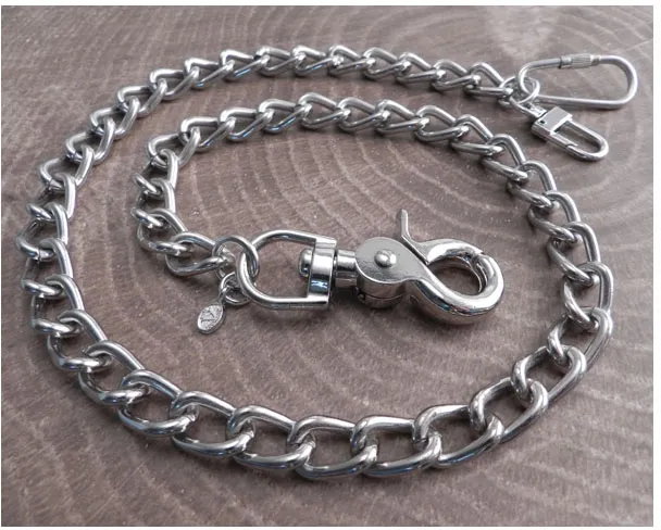 Silver, medium-sized chain with smooth twisted links, chrome-plated steel, chain links 5/8" length by 1/2" width, the sturdy snap hook and dual wallet hook end-pieces adds approximately 3" to the chain length