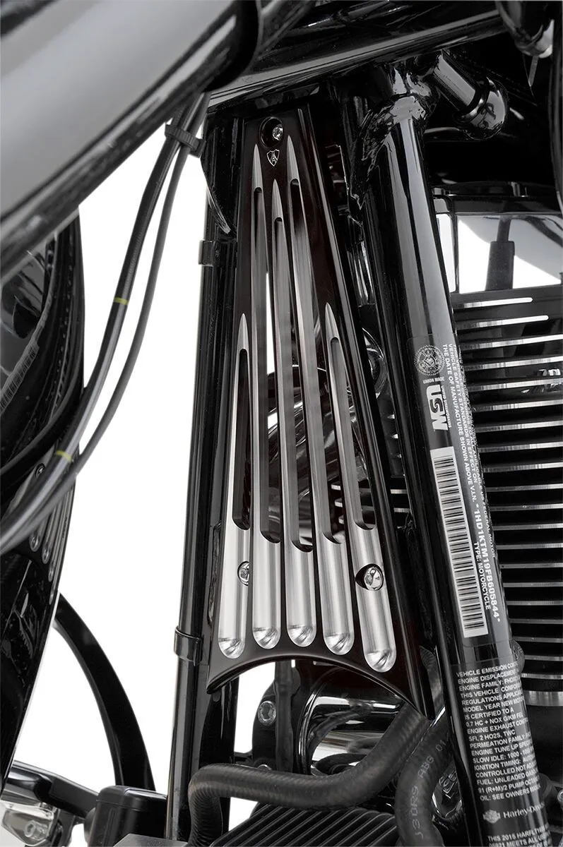 ×Each Frame Grill is machined from billet aluminum in the USA. Adds Deep Cut style to the front frame section and in result takes eyes away from the unfinished looking areas of the frame. In addition to style, the Frame Grill offers protection for the front cylinder of the engine from road debris.