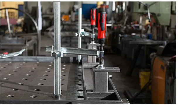 ×Max. clamp height: 200mm. Throat depth: 30-150mm. Overall height: 265mm. Rail dimensions: 22x8.5mm. Mount hole diameter: 16mm. Weight: 1.2kg. Used on welding tables. With variable throat depth. Tempered steel profile and sliding arm for sprung and elastic clamping. The spindle is equipped with high quality 2-component plastic handle, threads are special surface-coated for a smooth and bind-less action.