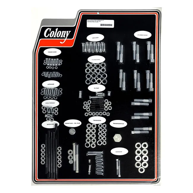 Each motor screw set contains all hardware like stock motor nuts, washers and studs for the specific engine in chrome or zinc plated. OEM reproduction hardware for early H-D models. Kit include, where applicable: