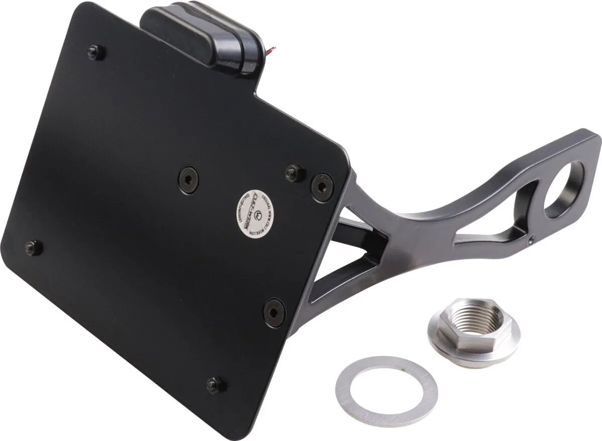 ×Gloss black powder coated CNC machined steel with pre-installed ECE approved LED license plate illumination.
