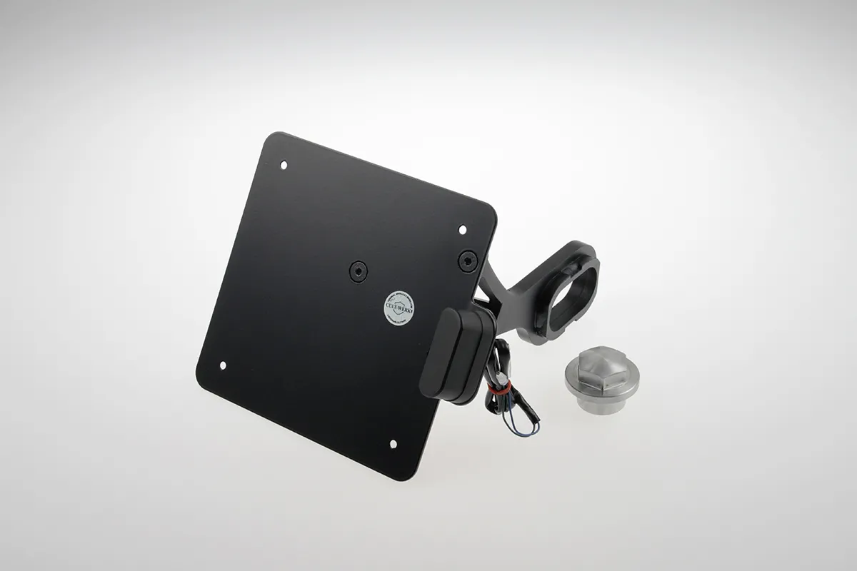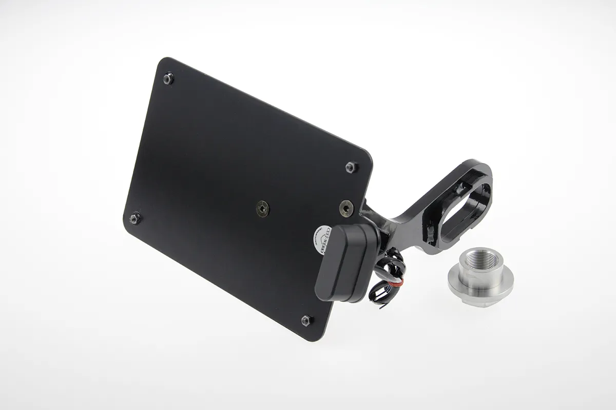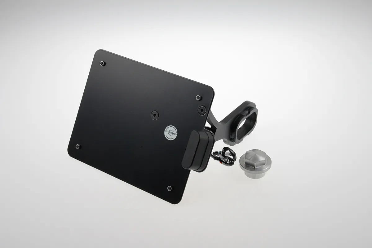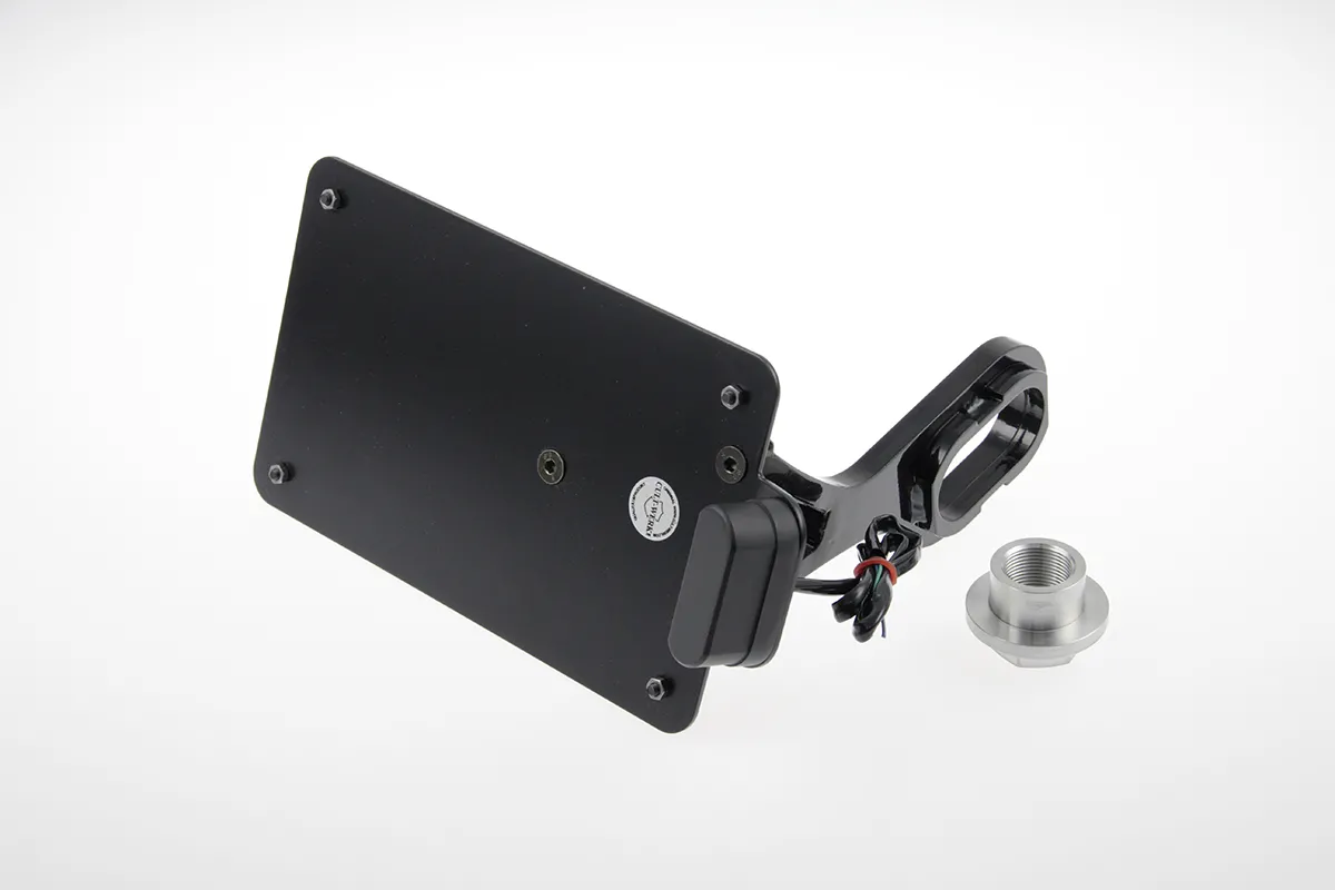 ×Gloss black powder coated CNC machined steel with pre-installed ECE approved LED license plate illumination.