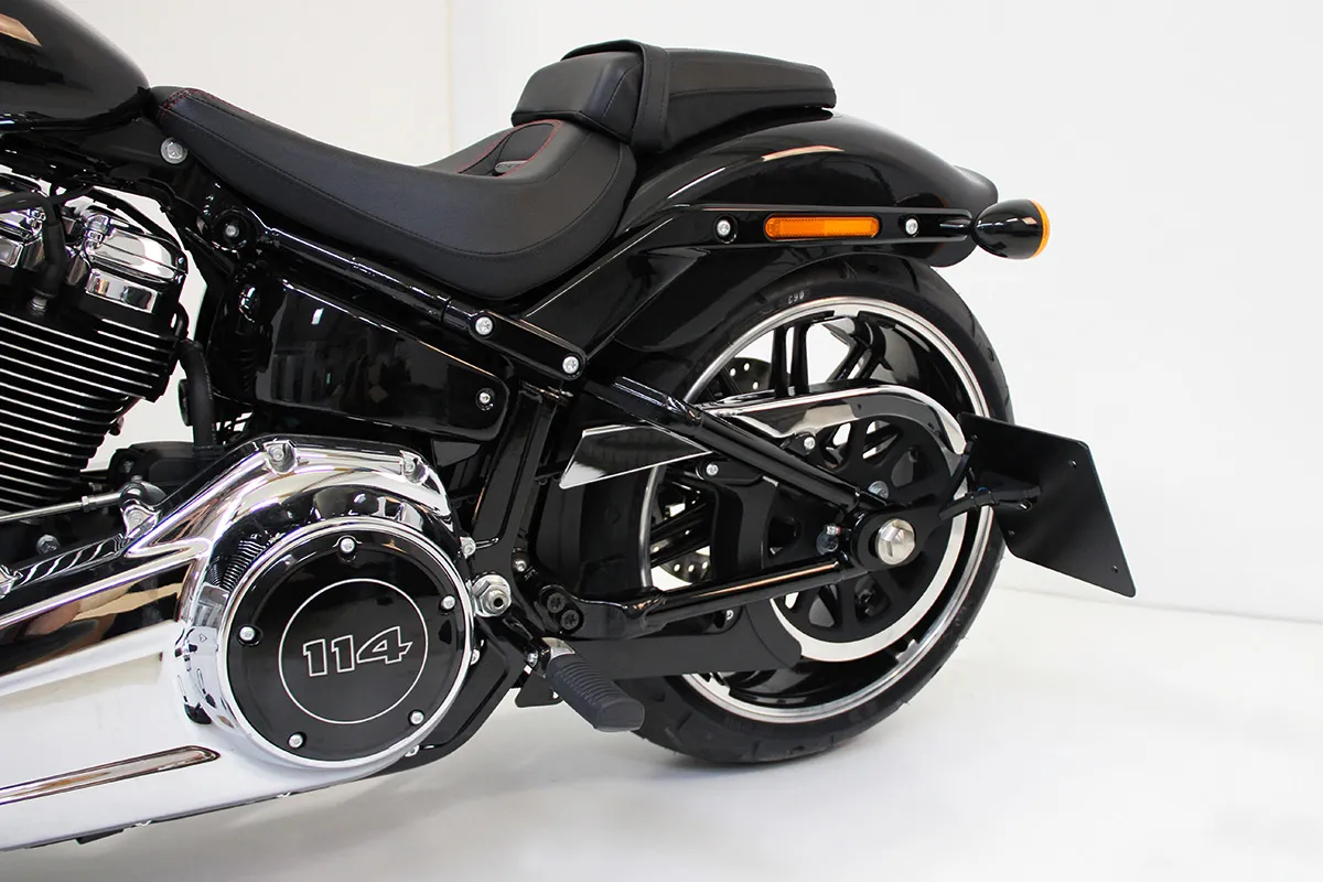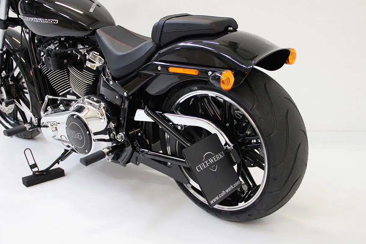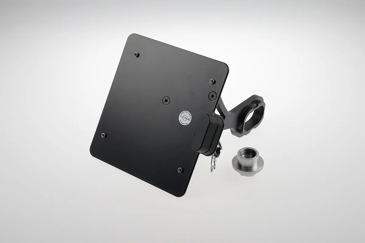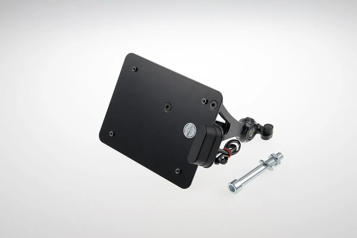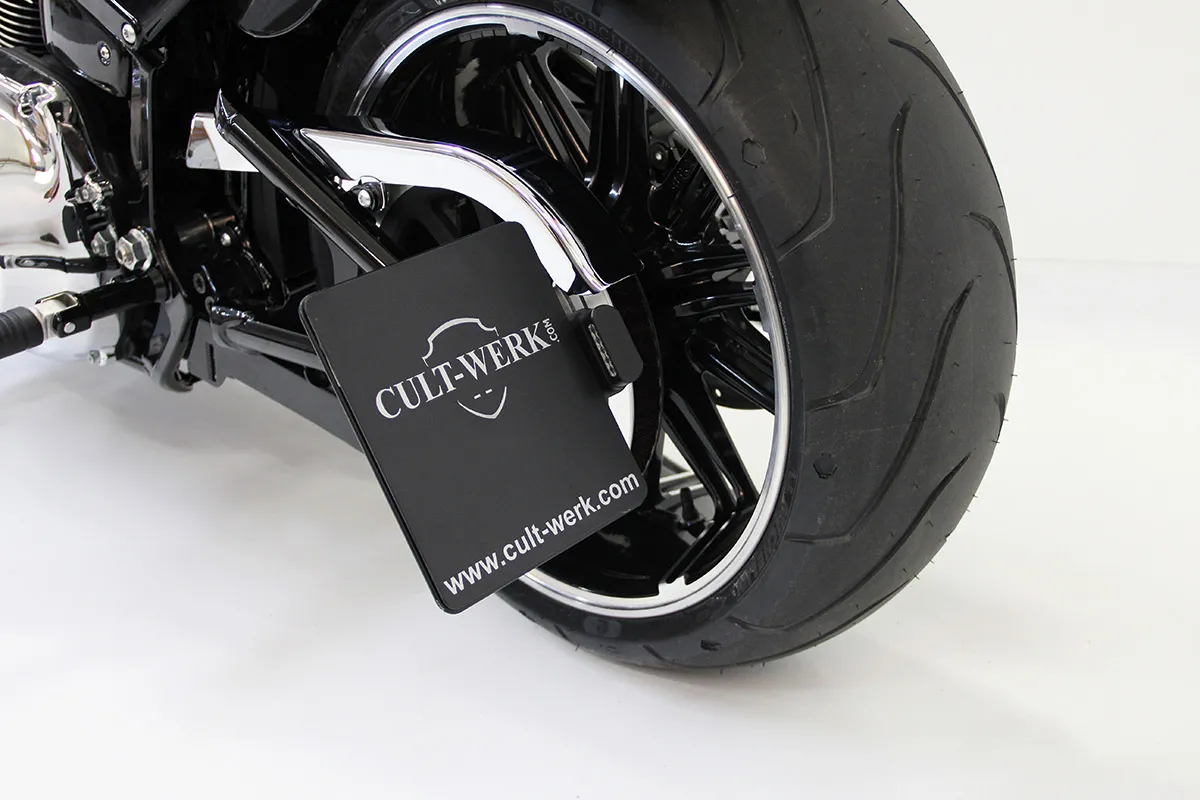 ×Gloss black powder coated CNC machined steel with pre-installed ECE approved LED license plate illumination.