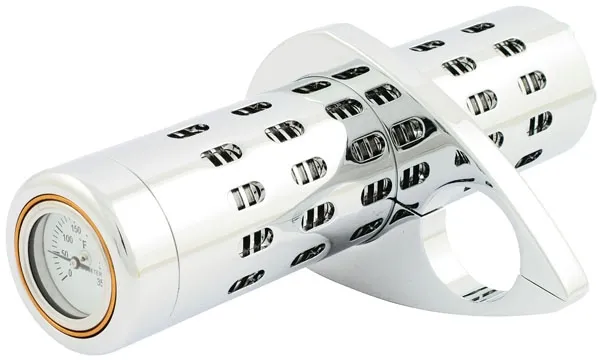 ×Chrome. With 1 clamp. Billet aluminum oil cooler with a built-in gauge. Includes a #6 AN fitting. Clamps to frame tubes of 1", 1-1/8", 1-1/4" and 1 1/2" diameter. Filler sleeves included to compensate for the mentioned frame tube diameters. Will work in many stock or custom applications. Approx. dimensions: 22cm long x 5.6cm diameter.