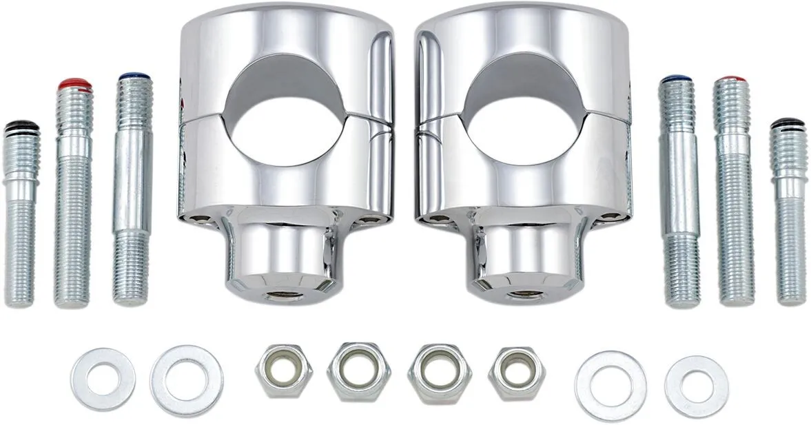 Risers are machined from billet aluminum. Brilliant show-chrome or smooth black finish. For use with Drag Specialties 38mm (1 1/2") Big Buffalo bars or other bars with a 38mm (1 1/2") diameter clamping area. Use 1/2" -13 riser bolts (Not included). Sold in pairs. Made in the U.S.A.