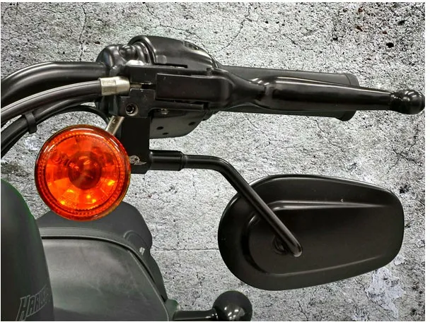 This simple bracket relocates the OEM or aftermarket mirror under the handlebar for a more aggressive and uncluttered look.