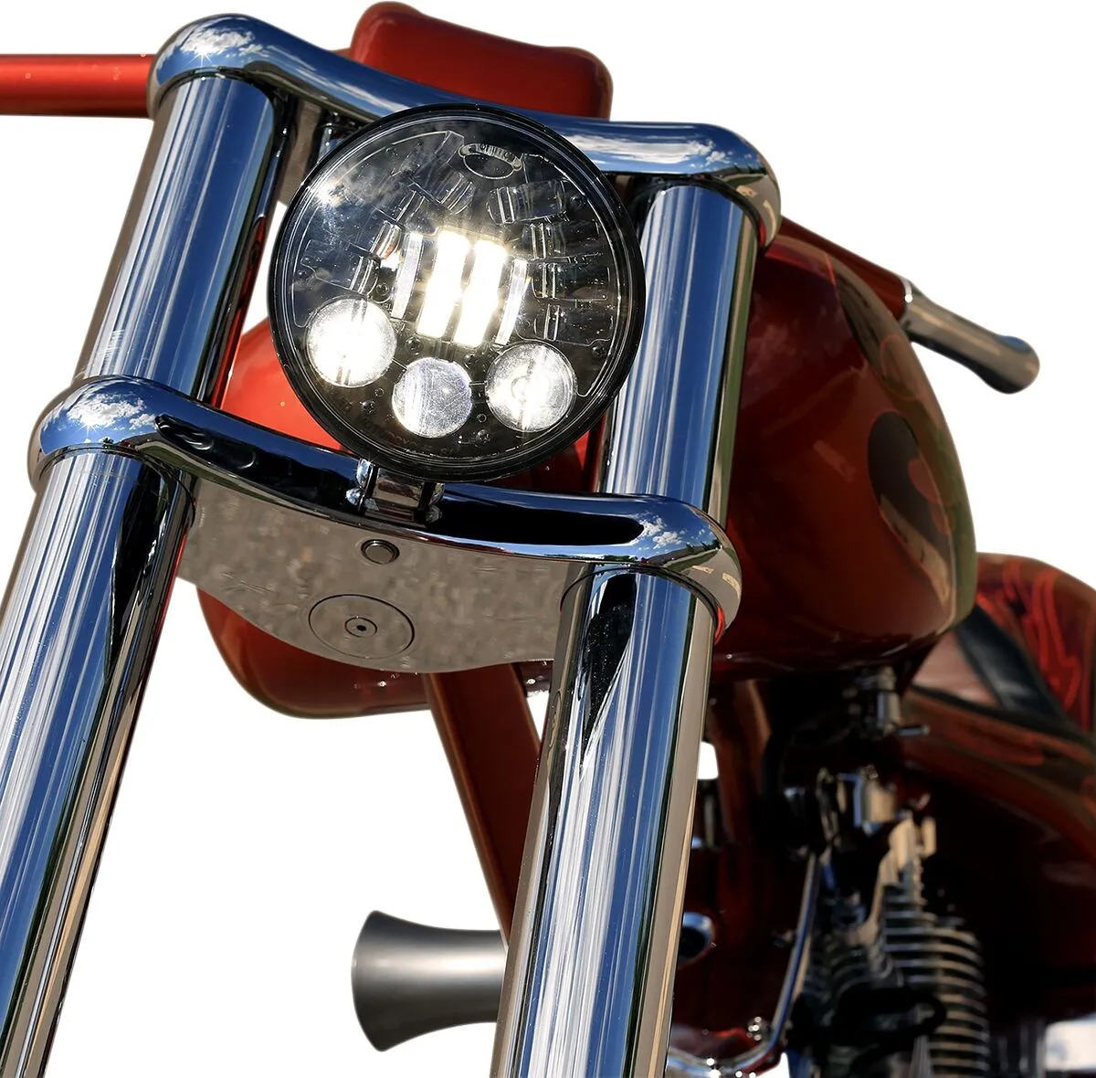 These LED motorcycle headlights feature a custom mounting bracket, allowing them to be mounted as pedestal headlights on applications without typical mounting buckets.