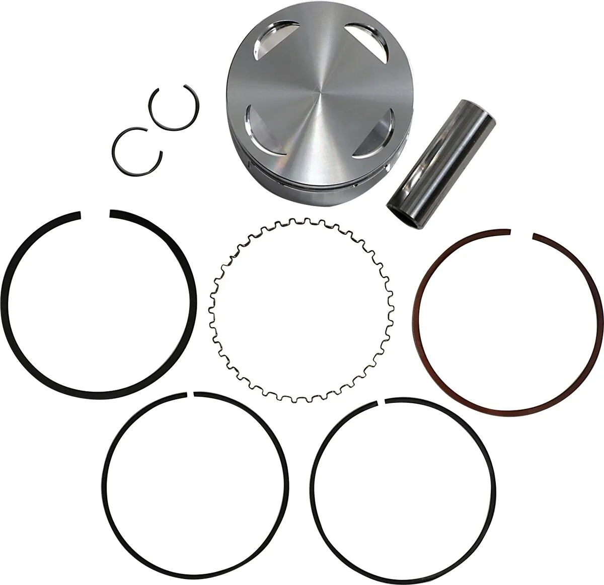 Piston Average Weight: 408 grams Piston Volume: 0.00 cc One cylinder piston kit. Includes: • 1x Piston • 1x Ring Set • 1x Wrist Pin • 2x Circlips