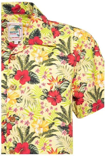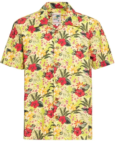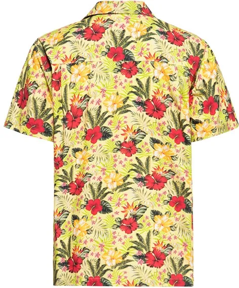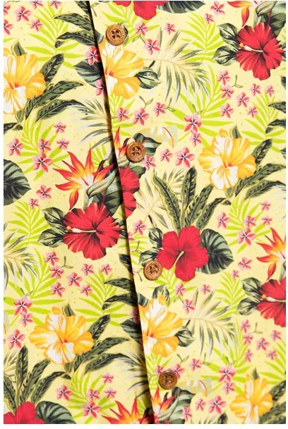 ×Authentic summer look in vintage style. With the King Kerosin tropical hawaii shirt with a cheeky all-over print you create a colorful look with a wow effect! The shirt is made from a blend of cotton and viscose, which is great for summer. A comfortable straight fit increases the pleasant wearing comfort in everyday life. The shirt also has a lapel collar, a fitted breast pocket and wooden buttons in the front. The perfect summer look is created in combination with Bermuda shorts and sandals!