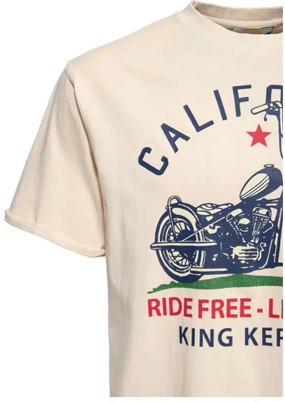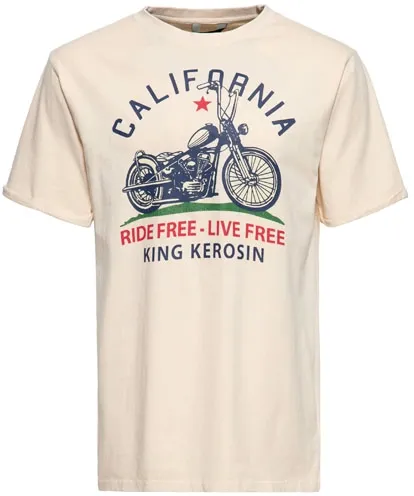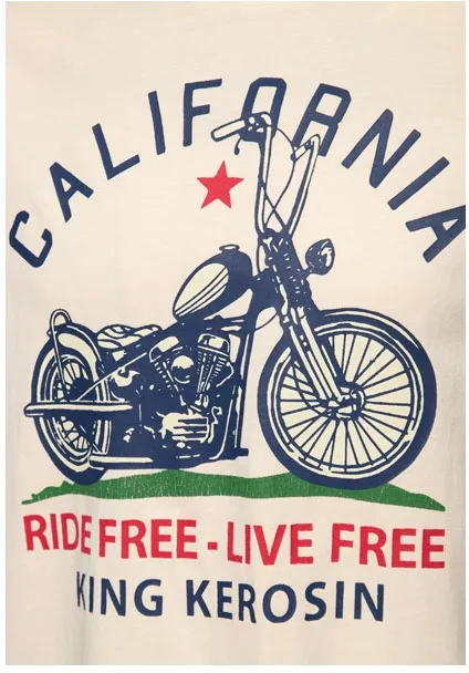 ×This King Kerosin California t-shirt is a real eye-catcher for motorcycle enthusiasts and fans of retro chic. With the old-school motorcycle artwork, a symbol of rebellion, freedom and the vibrant lifestyle of exciting times, this shirt brings the lifestyle of this unique era directly to you. The slightly thicker fabric gives the shirt a high-quality feel and a comfortable fit. A finely edged round neck and fixed rolled hem sleeves underline the authentic vintage look, while the slim fit ensures a close fit. This used-look t-shirt is not only a fashion statement, but also an expression of the passion for motorcycles and the culture they embody.