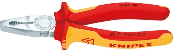 ×Insulated pliers made conform IEC 60900DIN, EN 60900 and VDE 0680. Individually tested at 10.000V to ensure safe working to up 1000 Volts. Manufactured from special forged tool steel that is multi-stage oil hardened. With gripping zones for flat and round material. The cutting edges are additionally precision induction hardened to approx. 60 HRC. Cuts 3.4mm mild steel to 2.2 hard wire. Comes with multi-component VDE grips, a polished head and is chrome plated. Overall length: 180mm. Weight: 264mm.