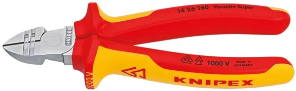 ×Overall length: 160mm. Weight: 216 gram. Insulated pliers made conform IEC 60900DIN, EN 60900 and VDE 0680. Individually tested at 10.000V to ensure safe working up to 1000 Volts. Manufactured from special forged tool steel that is multi-stage oil hardened. The elongated cutting edges are additionally precision induction hardened to approx. 60 HRC. Cuts up to 1.5mm mild steel. Cuts NYM cables up to 5 x 2.5mm. The dual precision stripping holes allows wire stripping of 1.5 and 2.5mm. Comes with multicomponent grips, a polished head and is chrome plated.