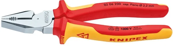 ×Overall length 200mm. Weight 343 gram. Insulated pliers, with extra long handles for additional leverage, made conform IEC 60900DIN, EN 60900 and VDE 0680. Individually tested at 10.000V to ensure safe working up to 1000 Volts. Manufactured from special forged tool steel that is multi-stage oil hardened. With gripping zones for flat and round material. The cutting edges are additionally precision induction hardened to approx. 63 HRC. Cuts 2.8mm o hard wire up to 2.2mm o spring steel. Comes with multi-component VDE grips, a polished head and is chrome plated.