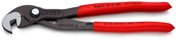 ×Overall length: 250mm. Weight: 328 gram. Maximum jaw opening: 32mm. Pliers and a wrench in one tool. Compatible with wrench openings from 10mm to 32mm (3/8" to 1-1/4") with a quick push-button operated 15-step adjustable ratchet. Automatic and very strong gripping action of the jaw with zero backlash for a non-damaging and non-slip grip on bolts or nuts. Improves grip on rounded-off nuts. Manufactured from forged chrome vanadium tool steel that is multi-stage oil hardened. Comes with non-slip plastic coated grips, a polished head and gray phosphate coating.