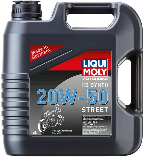 ×Language label D-Booklet. Full synthetic motor oil / engine oil for air and water-cooled 4-stroke motorcycle engines, especially suitable for Harley-Davidson. Selected base oils and high-quality additive components ensure optimal lubrication, outstanding engine cleanliness and excellent friction values in all operating conditions. For use in road, off-road and racing engines operated under normal to extreme conditions, this includes all Harley-Davidson models requiring a synthetic 20W-50 motor oil. - approval API SN PLUS,JASO MA2 - for wet or dry clutches - stable to ageing and stable viscosity - excellent wear resistance - outstanding corrosion protection - high engine cleanliness - outstanding high temperature stability - Liqui Moly recommends this oil to be used as a replacement for OEM 62600042