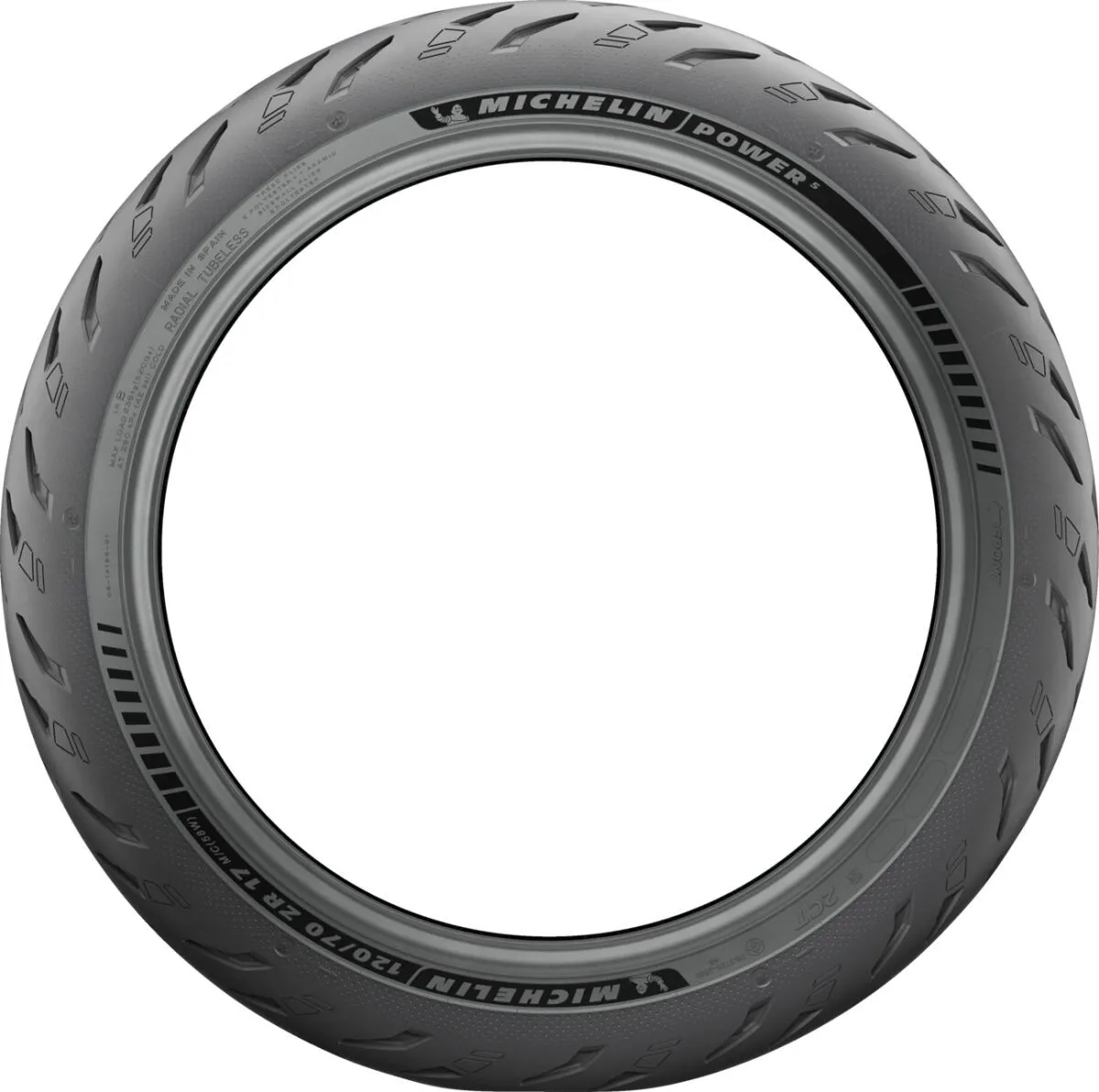 CONSTRUCTION: R (Radial) LOAD/SPEED INDEX: (58W) Sidewall: Blackwall Units: Each Product Name: Tire Tread Pattern/Model: Power 5 Market Segment: Cruiser / Street SECTION WIDTH: 120 RIM DIAMETER: 17 ASPECT RATIO: 70 POSITION: Front Tire Size: 120/70R17 TUBE TYPE: Tubeless