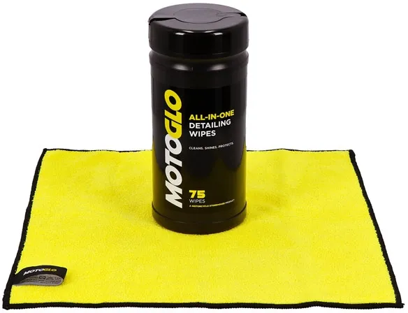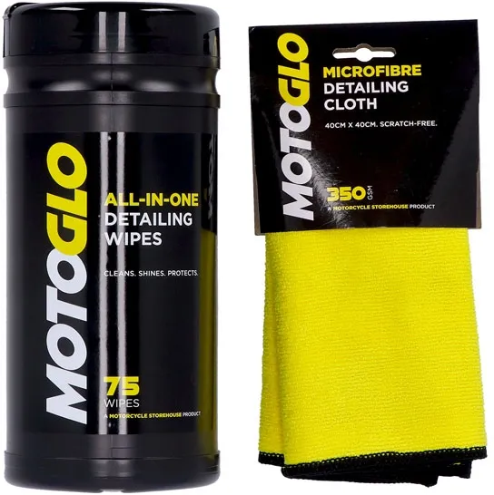 ×- Includes: 75 wipes of 20cm x 25cm - Dispenser dimensions: 24cm high x 11cm diameter - Microfiber cloth. Combi-pack of the 975400 dispenser, containing 75 20cmx20cm pre-moistened detailing wipes, and 984573 microfiber polishing cloth. This are detailing wipes, designed to clean your bike without or with little water, depending on the amount of dust, dirt and grime. MotoGlo wipes are pre-moistened with a special Eco-Friendly, non-aggressive & chemical-free fluid. Safe for your hands and for any surface on your bike, but with incredible cleaning characteristics. After the cleaning routine the MotoGlo wipe will ''fill the surface'', on a molecular level, to help prevent new dirt attaching but also protects against salt, greasy fingers, UV radiation and by doing so it even intensifies gloss. This protection-effect will increase with every new cleaning. The Microfiber polishing cloth (separately available as 984573) will create the perfect surface finish.