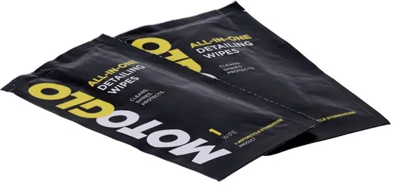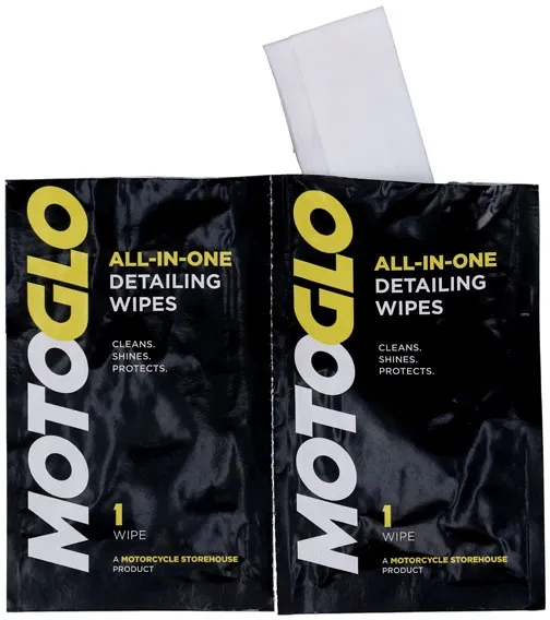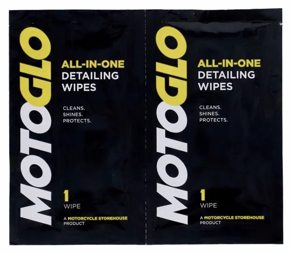 ×- Includes: 2x Try Out detailing wipe of 13x18cm This are detailing wipes, designed to clean your bike without or with little water, depending on the amount of dust, dirt and grime. MotoGlo wipes are pre-moistened with a special Eco-Friendly, non-aggressive & chemical-free fluid. Safe for your hands and for any surface on your bike, but with incredible cleaning characteristics. After the cleaning routine the MotoGlo wipe will ''fill the surface'', on a molecular level, to help prevent new dirt attaching but also protects against salt, greasy fingers, UV radiation and by doing so it even intensifies gloss. This protection-effect will increase with every new cleaning. Note: See 975400 for dispenser with 75 wipes of 20cm x 25cm.