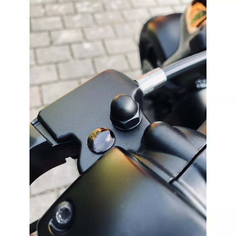 Set of two black powder coated stainless steel 5/16-24 UNF acorn nuts and spring washers for all handlebar mounted mirrors on 1982 to present Big Twin, FXR, Softail, Dyna, Touring and XL & XR Sportster. Can also be used to replace OEM 7331 chrome acorn nuts.