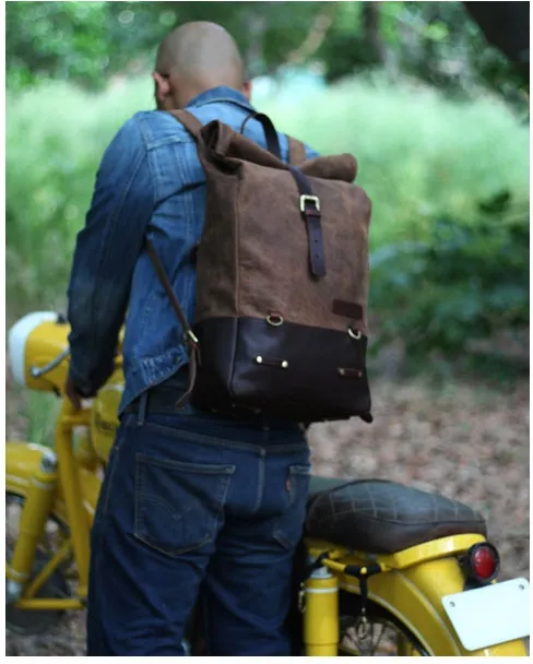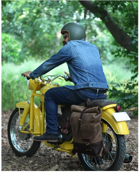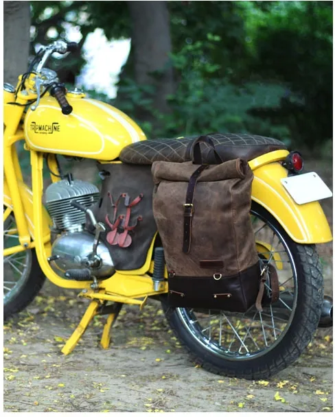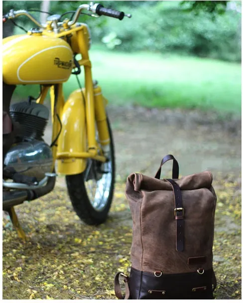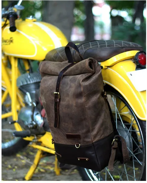 ×This backpack is a high quality hand made build that is ready for dual use, on your back or as saddlebag. Made completely from 100% Heavy Duty leather and 0% compromise. Made for years of use and the looks get better with every trip. Designed to be easy on/off install on the motorcycle in a matter of seconds. A backpack for true everyday use. The classic roll-top design provides additional flexibility. Comes with a carrying handle for when off-bike. Approx. dimensions: 18" (46cm) x 10" (25cm) x 5" (13cm) (with roll-top rolled). Approx. capacity: 15 liter.