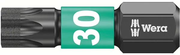 ×1/4" drive, 25mm long. Diamond coated bit head to prevent slipping. Compatible with impact drivers. Compatible with 1/4" drive DIN ISO 1173-C 6.3 bit holders. Color coded for head style (Green = Torxr) and printed for size. Series 867/1 IMP DC - Torxr Impaktor bits. Size: TX30.