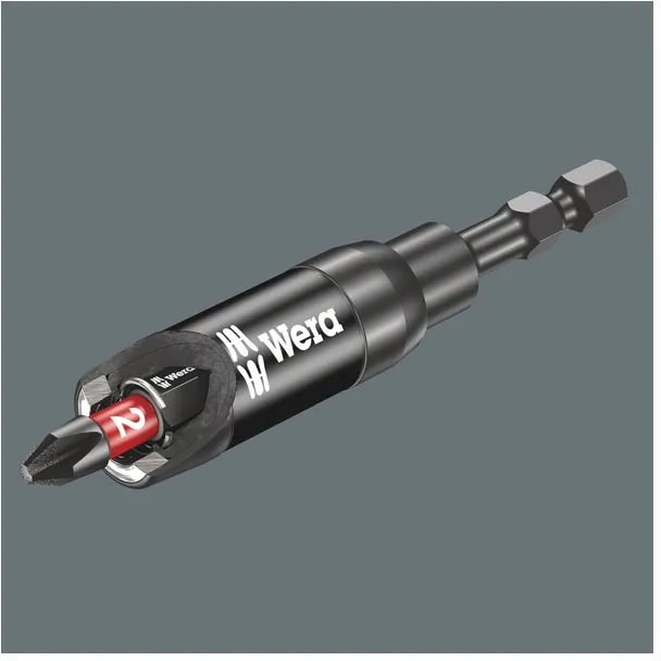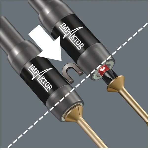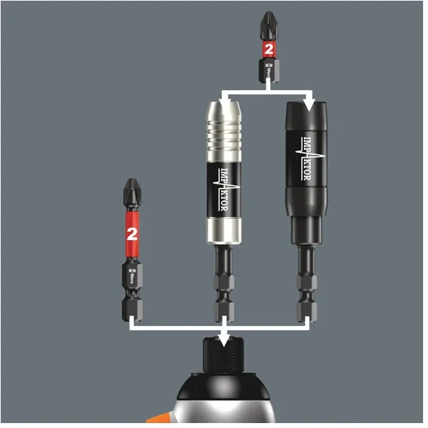 ×897/4 IMP R SB. The Impaktor is a 1/4" drive bit holder that cushions impact pulses of hard hitting impact screwdrivers by means of a double torsion spring and an additional steel torsion zone. It is equipped with a strong ring magnet, to securely hold screws. The magnet is held with a retaining ring and can be removed if desired. Overall length 75mm. Compatible with 1/4" drive DIN ISO 1173-C 6.3 bits.