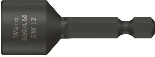 ×869-4 M. For hex bolts and nuts. Compatible with 1/4" drive DIN ISO 1173-F 6.3 bit holders. Magnetic. Overall length 50mm. Size: 12mm.