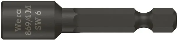 ×869-4 M. For hex bolts and nuts. Compatible with 1/4" drive DIN ISO 1173-F 6.3 bit holders. Magnetic. Overall length 50mm. Size: 6mm.