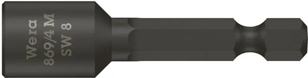 ×869-4 M. For hex bolts and nuts. Compatible with 1/4" drive DIN ISO 1173-F 6.3 bit holders. Magnetic. Overall length 50mm. Size: 8mm.