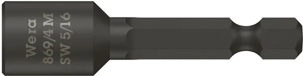×869-4 M. For hex bolts and nuts. Compatible with 1/4" drive DIN ISO 1173-F 6.3 bit holders. Magnetic. Overall length 50mm. Size: 5/16".