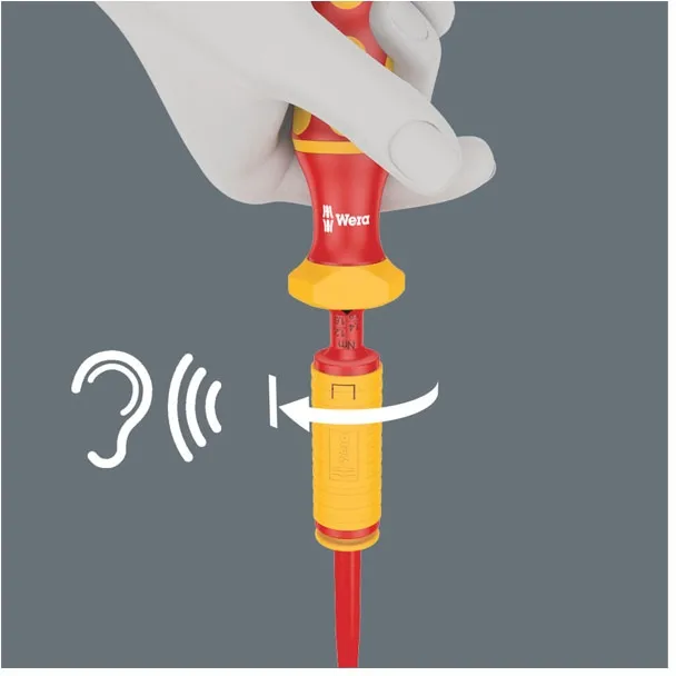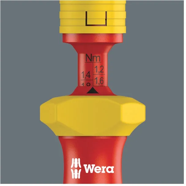 ×7441 VDE insulated torque shaft handle. 1.2 to 3.0 Nm adjustable. Compatible with Wera compact VDE 9mm hexagonal interchangeable screwdriver shafts only, which offer a simple click-fit installation and pull-back knob release. Allows working with live wiring up to 1000V, individually tested as per IEC 60900. Torque handle measurement accuracy is 6 % in accordance with the standard EN ISO 6789. The torque signal can be both felt & heard. With multi-component Kraftform shaped grip. Note: Wera individual insulated VDE compact screwdriver shafts are separately available.