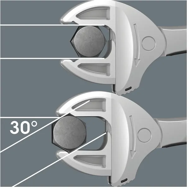 ×Adjustable wrench with ratcheting action. Lever mechanism when gripping avoids slipping and damage. Size 10-13mm, 7/16-1/2 inch, overall lenght 154mm.