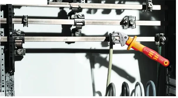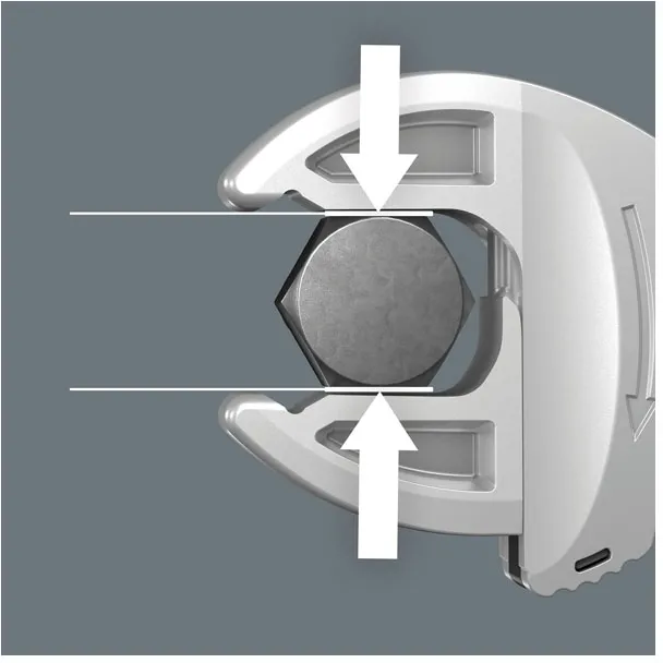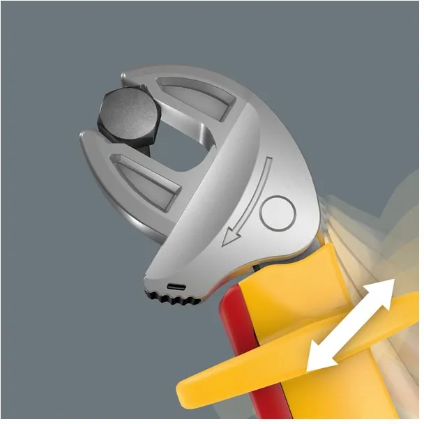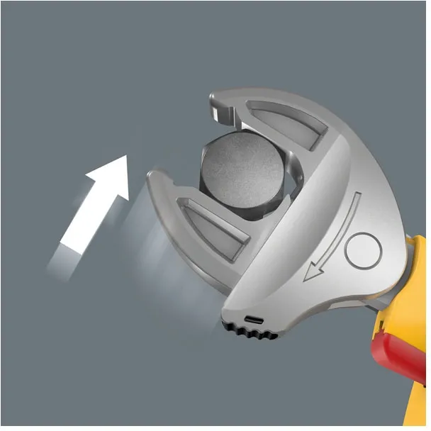 ×Small. 10-13mm in metric and 7/16" to 1/2" in US sizes. Mouth width 10mm, overall length 155mm. VDE (Verein Deutsche Elektriker) insulated self setting spanners. Individually tested at 10.000 Volts, in accordance with IEC 60900, which ensures safe working with live wiring up to 1000 Volts. The sliding function allows safe opening of the jaws. Contacting the non-insulated jaws is not required. The 6004 series Joker is similar to a regular adjustable wrench, and that is also where the similarity stops. The Joker is auto-adjusting and with its smooth parallel jaws it offers a secure grip on bolt and nuts, without causing damage. Additionally it has an actual built-in ratcheting function with a 30 back-pivoting angle.