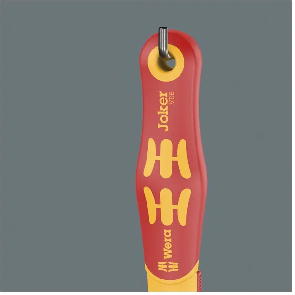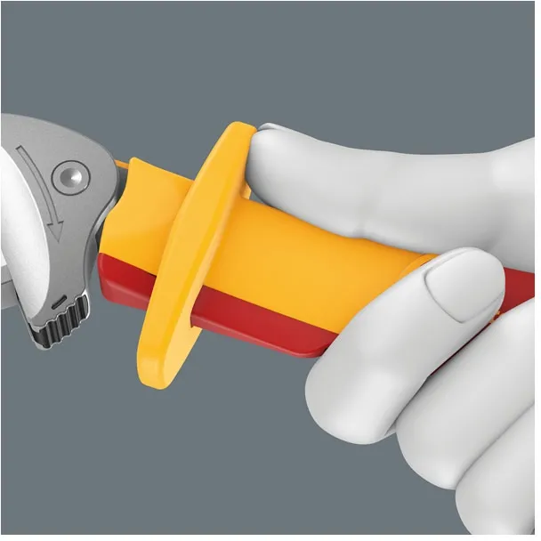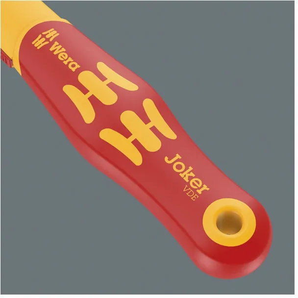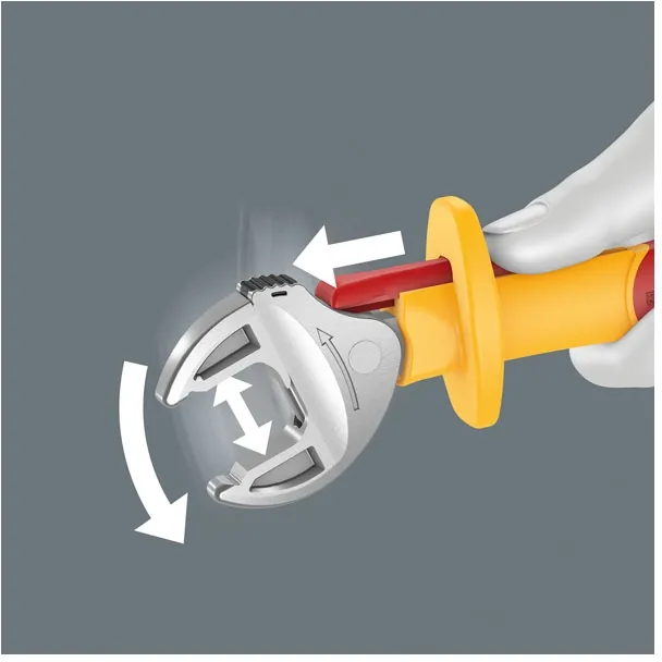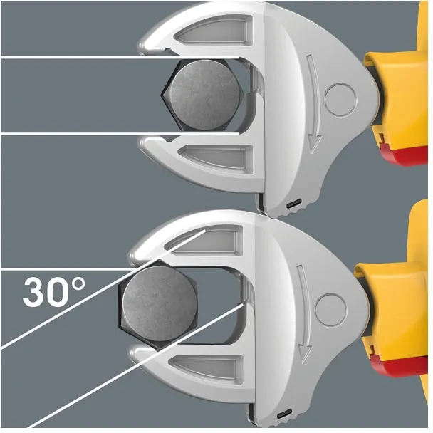 ×Large. 16-19 mm in metric and 5/8" to 3/4" in US sizes. Mouth width 14mm, overall length 226mm. VDE (Verein Deutsche Elektriker) insulated self setting spanners. Individually tested at 10.000 Volts, in accordance with IEC 60900, which ensures safe working with live wiring up to 1000 Volts. The sliding function allows safe opening of the jaws. Contacting the non-insulated jaws is not required. The 6004 series Joker is similar to a regular adjustable wrench, and that is also where the similarity stops. The Joker is auto-adjusting and with its smooth parallel jaws it offers a secure grip on bolt and nuts, without causing damage. Additionally it has an actual built-in ratcheting function with a 30 back-pivoting angle.
